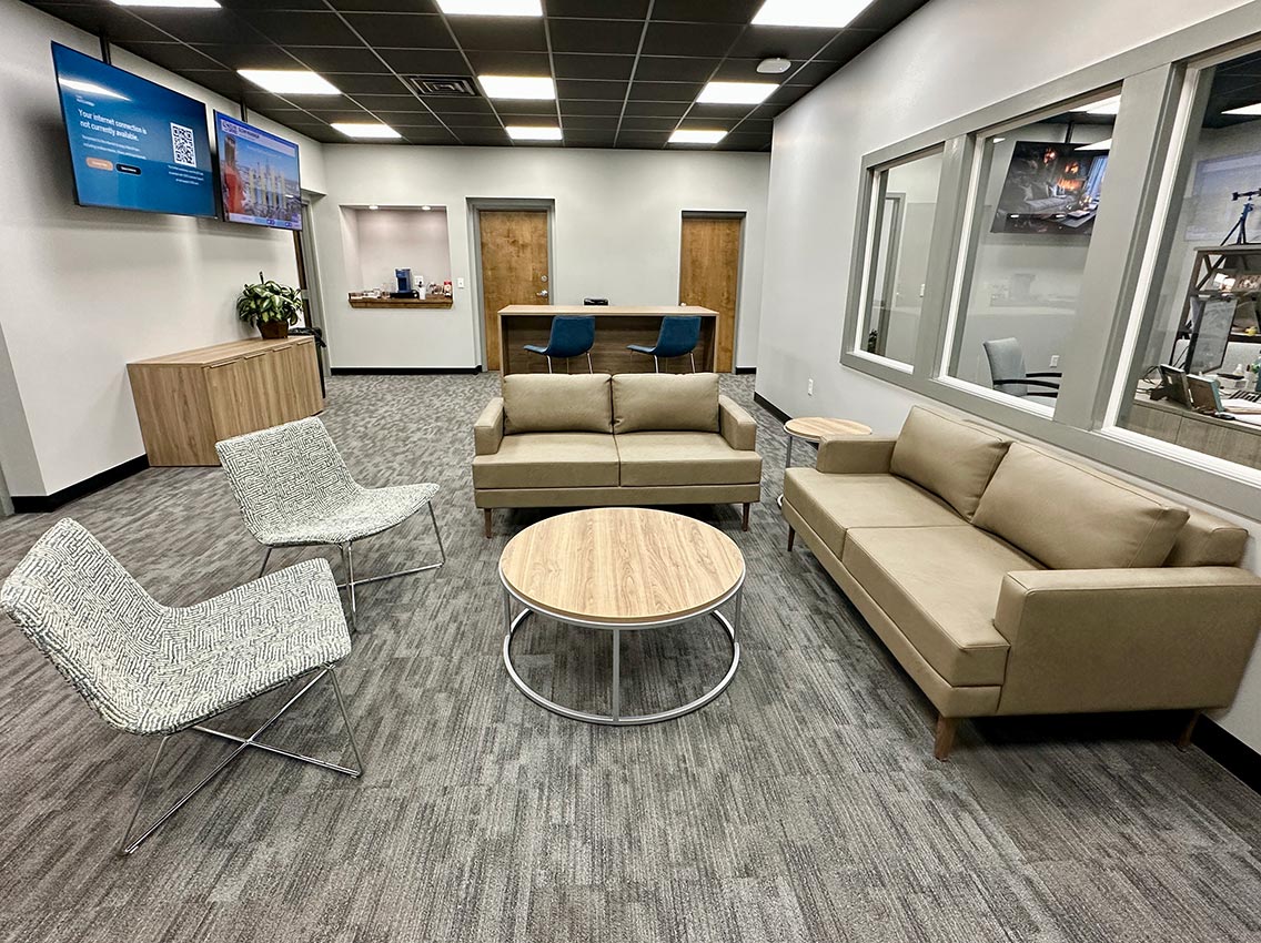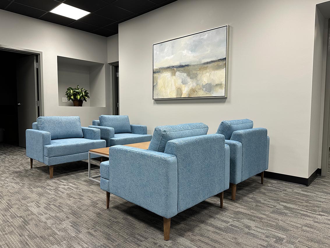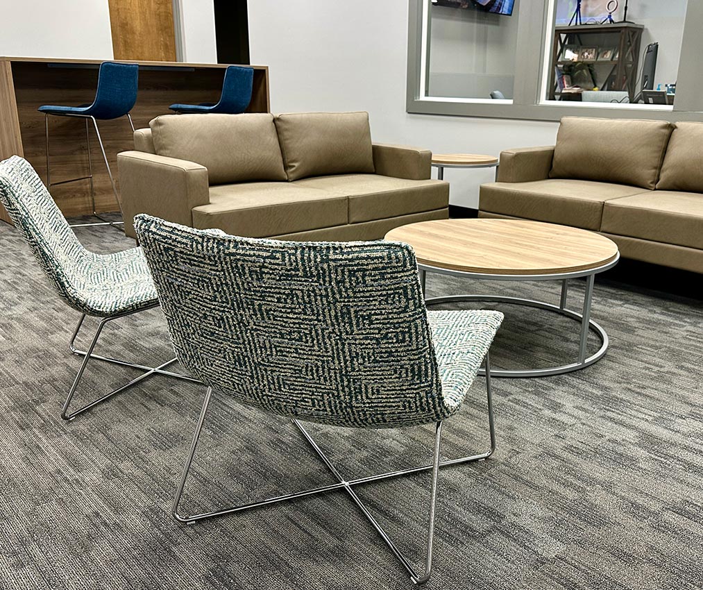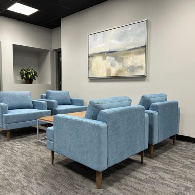 New install in a hospital waiting room in Alabama. The new space includes Kindl guest chairs and Baja stools with Parallon cafe tables.